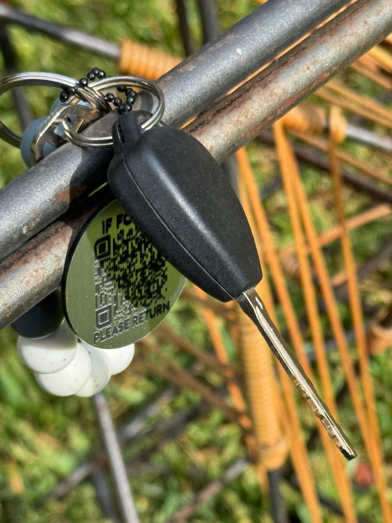 On the way out, Gillian saw a set of keys on a bench and picked them up. On the keyring was a disc with a QR code.