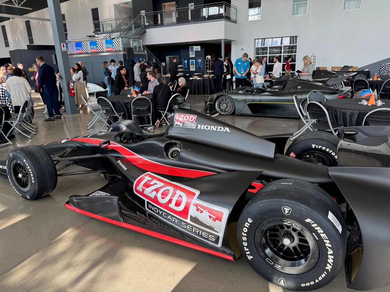 A reception was held at the Dallara IndyCar Factory. One part was a showroom of race cars, shown below. The other part was a factory and I took the tour, which was fascinating.