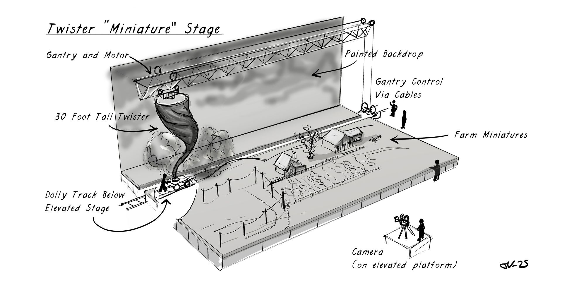 The tornado itself consisted of a 35-foot-long muslin “stocking” (likely a windsock from an airport runway), photographed moving behind miniatures of a Kansas farm and fields placed in the foreground. The muslin stocking was hung from a large rotating plate, attached to a high-speed motor, mounted to a gantry crane running the length of the studio ceiling. While spinning, this muslin funnel could be moved up and down, twist, and sway — mimicking the motion of a real tornado. The entire mechanism was manipulated with wires and pulleys, giving the filmmakers precise control over the funnel’s movement.