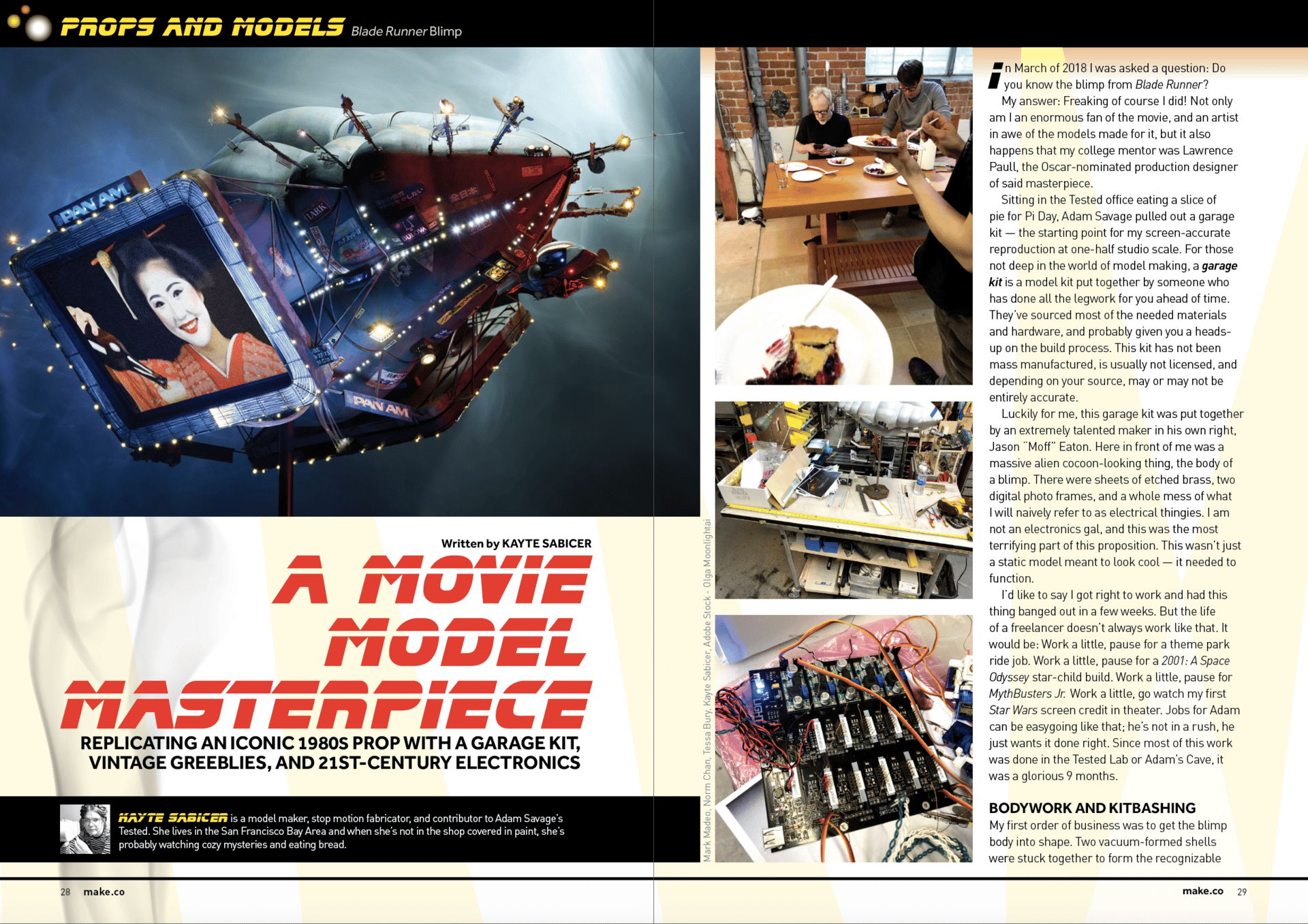In Make: Vol 94, pro model maker Kayte Sabicer describes how she started her project to build a half-size replica of the Off World blimp from Blade Runner using a garage kit. Kayte writes:
