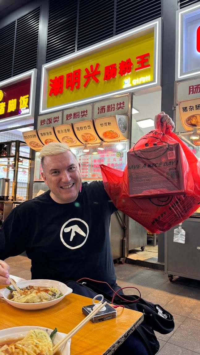 The author, shopping and eating like a local at Huaqiangbei