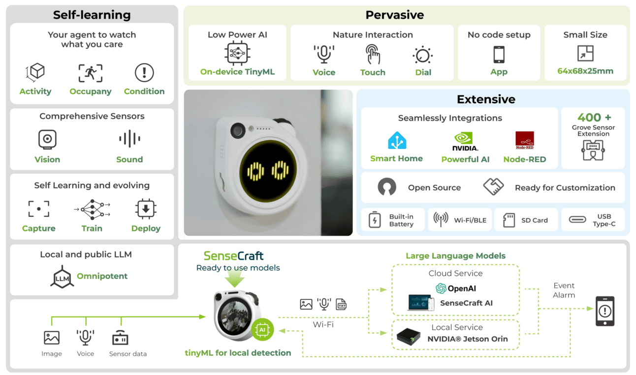 Perhaps the coolest and most unique “display” I’ve been playing with lately is Seeed’s SenseCAP Watcher. This one won’t be out for a while – in fact the Kickstarter campaign isn’t even live yet – but I’ve been lucky enough to get my hands on one of the few alpha units that Seeed has produced, and I’m really excited with what I’ve seen so far. One of the ideas I’ve been spending a lot of time thinking about recently is the intersection of large language models and microcontrollers – enabling AI to interact with the physical world, as opposed to web-based tools and apps that just output text or images (usually with the wrong number of fingers). Watcher gives us a really interesting preview of this world, with both on-device tinyML models, easily selected from the SenseCraft zoo using the device itself, combined with the powers of an LLM in the cloud via the companion app. This allows users to, for example, say “send me a notification if you see a delivery person in a brown uniform” – instead of having to wait around for UPS to arrive – and without having to write any code or create your own custom hardware. While the device’s ESP32-S3 would be perfectly capable of all sorts of interesting tinyML deployments, what really has me excited about this device is the Himax HX6538, which includes both a Cortex M55 MCU and an Ethos-U55 NPU (neural processing unit) optimized for high-speed inference. Plus to bring us back around to the overarching theme, it has a 1.45” 412x412 pixel touchscreen – though thanks to the the built-in 5MP OV5647 image sensor, it will probably spend more time looking at you than you spend looking at it!