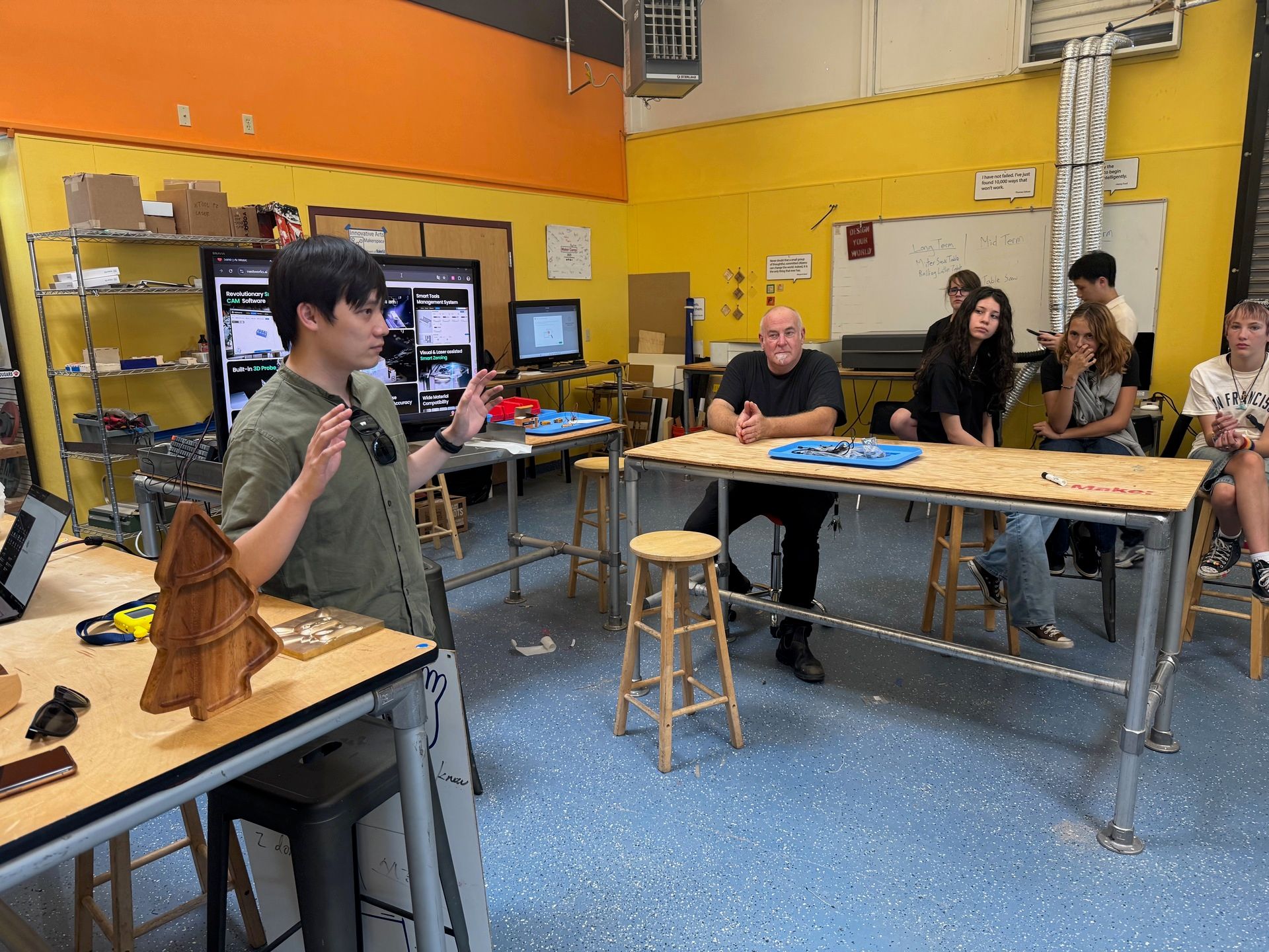 Henry Lin speaking to students and Marty Marfin, makerspace manager at the Academy of Innovative Arts (AIA)