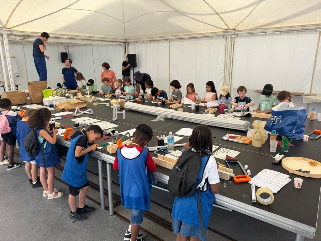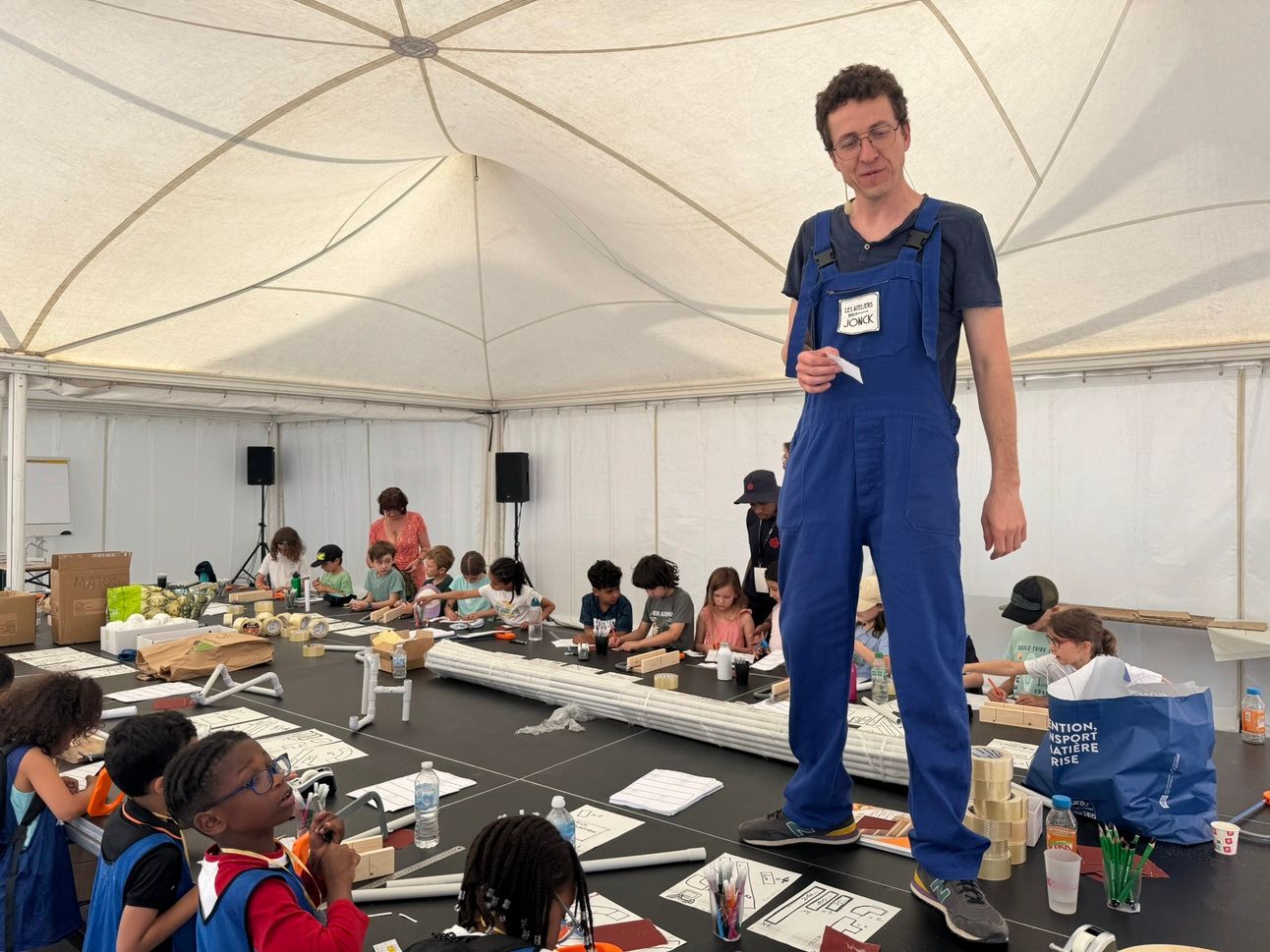 Kids had a lot of hands-on activities to do at Maker Faire Lille. At the Giant Workshop tent, the kids were cutting PVC pipe and making a kind of marshmallow shooter — although these were designed to shoot a paper cap. The facilitator — today it was Fabian — stands atop the tables like a conductor urging forty students to play with PVC pipes. They seemed to take to this project.
