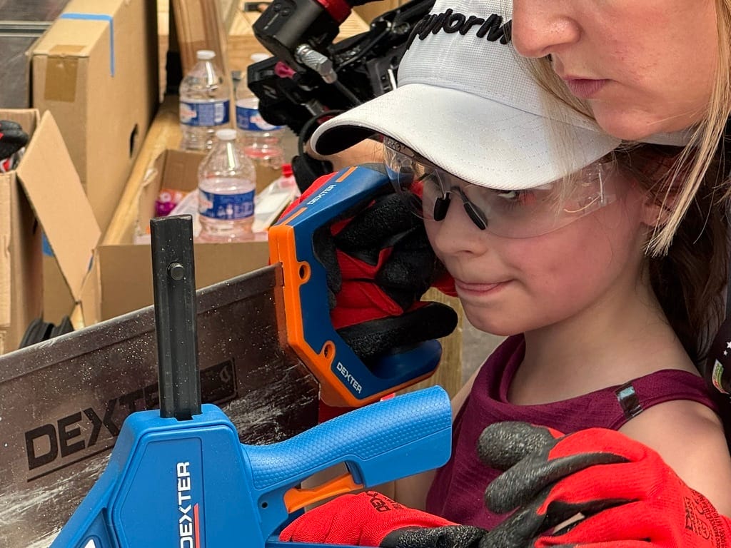 In the Leroy Merlin booth, kids were busy learning to saw.