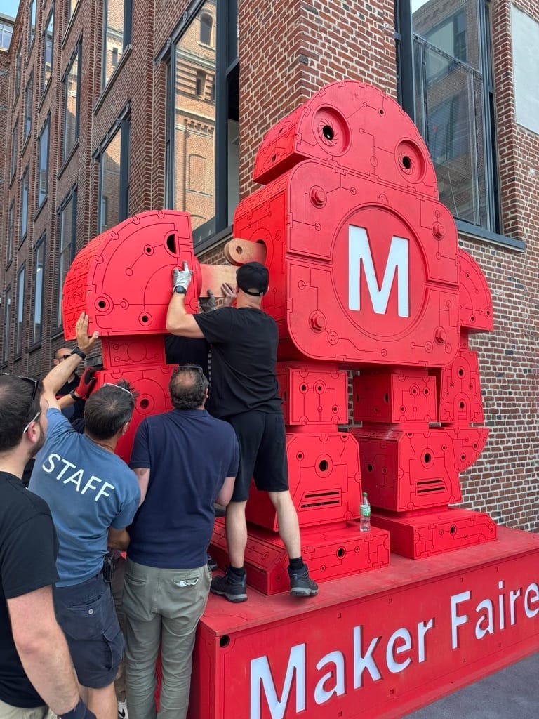 “Un, deux, trois …” A crew did the heavy lift of Makey’s arm and put it in place at Maker Faire Lille (photo by Dale Dougherty)