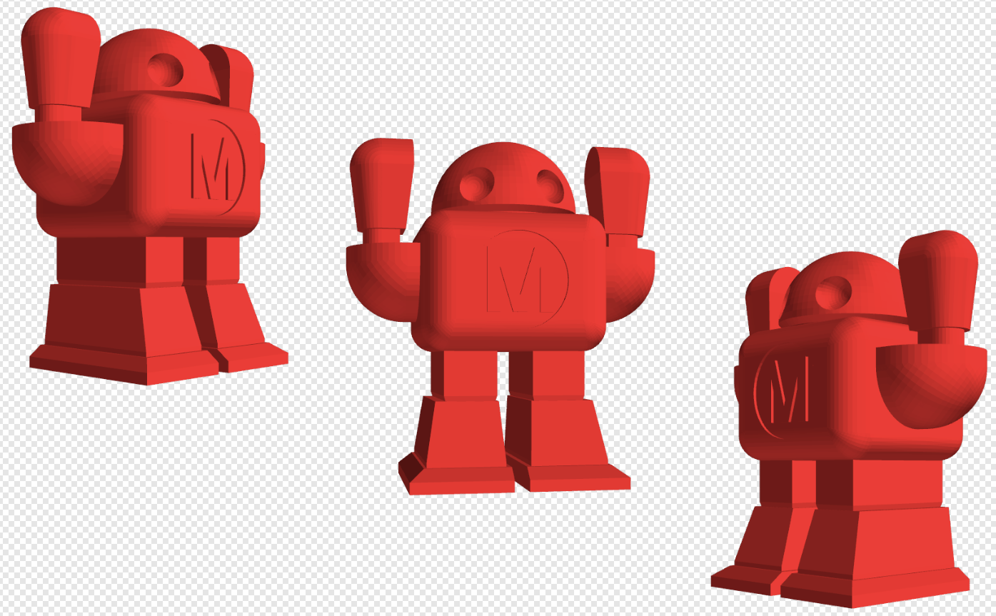 To run this program, you’ll need to tell it which STL to render and what color to use. I downloaded the Maker Faire robot STL, and ran my script, which gave me the three images I needed: