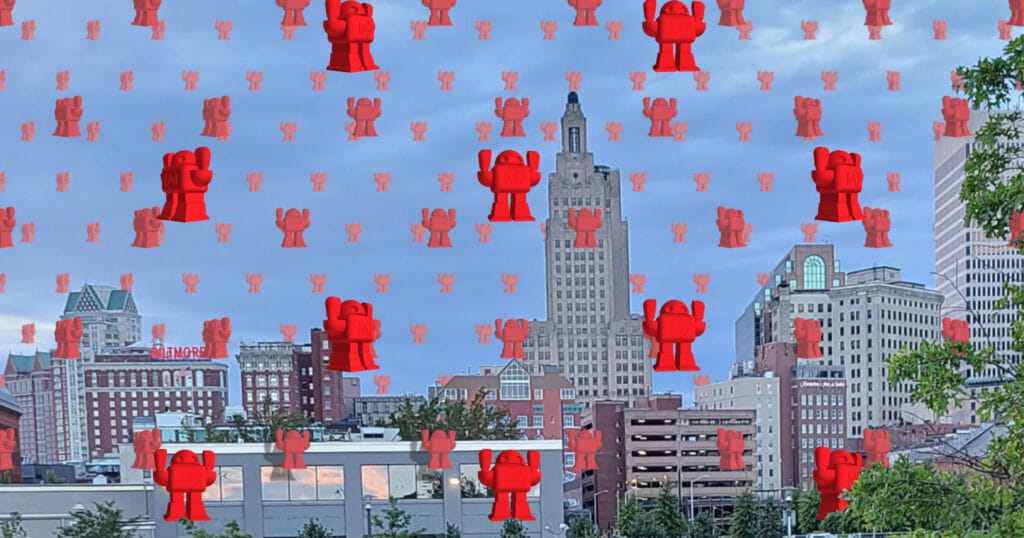 When I started preparing for Maker Faire Providence 2025, I decided it was time for some fresh design work. In years past, I’d usually pick a photo from a prior year for the hero image. This time, I decided to put a little more design effort into our hero image. My parents had a book of René Magritte’s work that I always enjoyed flipping through as a child, so I thought I’d attempt a tribute to one of Magritte’s paintings. I wanted to incorporate something suggestive of Providence, and I also wanted to include the Maker Faire robot, Makey.