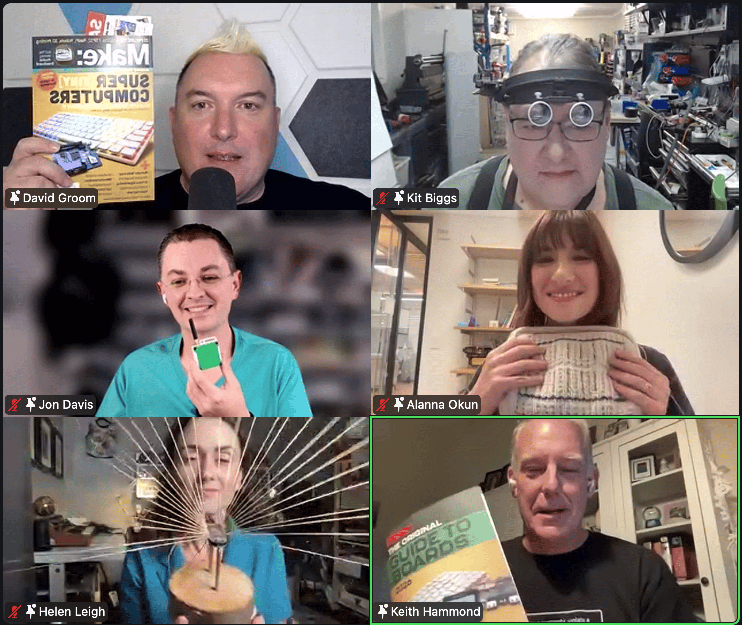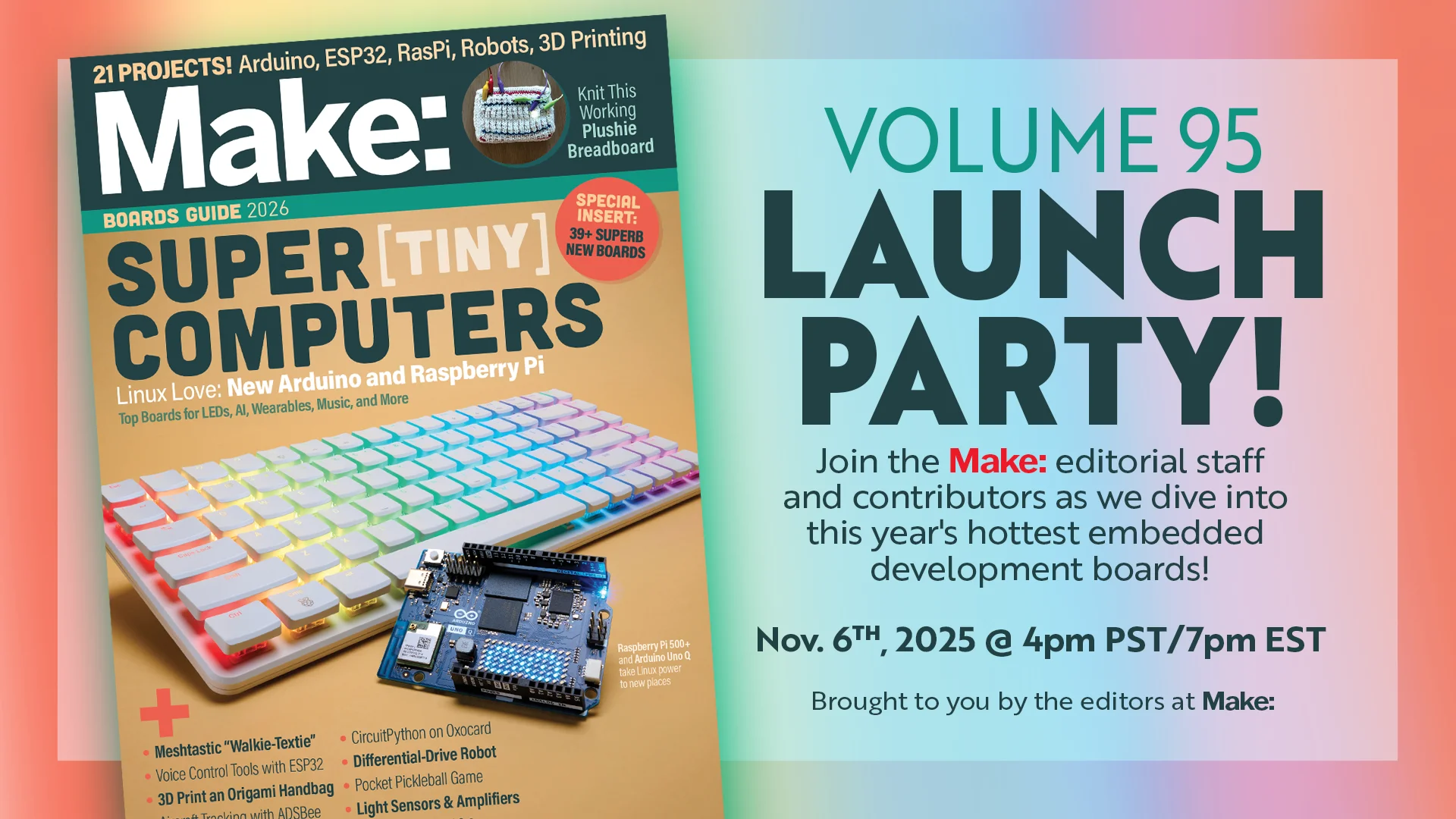 Editors David Groom and Keith Hammond of Make: hosted our Vol: 95 launch party, which featured Kit Biggs talking about voice-activated gadgets, Jon Davis showing his Meshtastic devices, Alanna Okun explaining how she knitted a working breadboard, and Helen Leigh talking about the microcontrollers she uses to make musical art. As much as I enjoy seeing makers and their projects, I enjoy even more seeing the fun, supportive interactions among them.