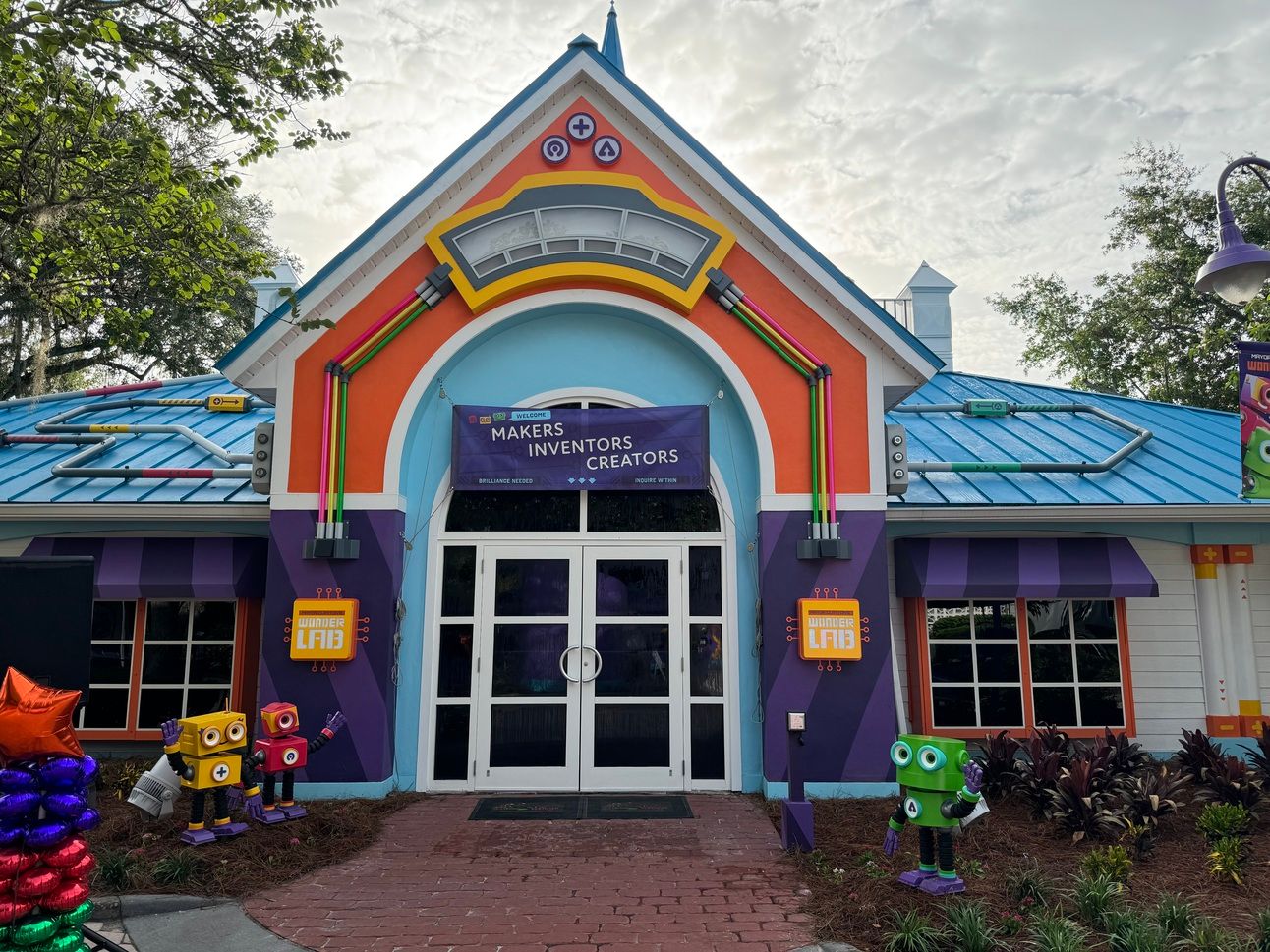 Outside of the WonderLab, you see the red, yellow and green Wonderbots.