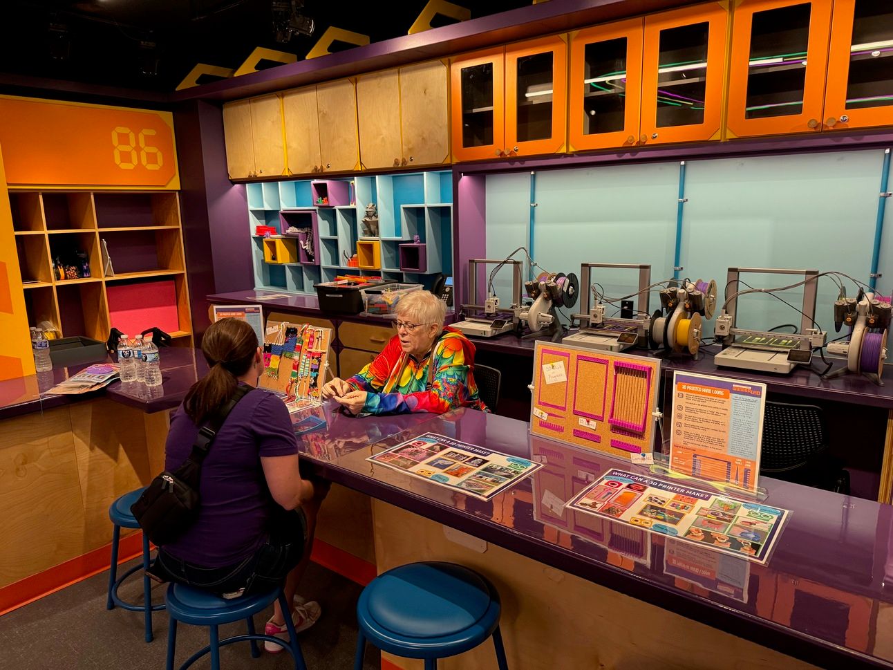 At the Brilliance Bottler, kids push buttons to play games that increase the flow of liquid in the tanks that are “connected” to the pulsing neon tubes that run throughout WonderLab. There are six different rooms or areas such as Tech 101 where you can use 3D printers and use 3D printed handlooms; the Test and Try lab where children can operate two Spark-e animatronic figures; and the Volts and Bolts Studio, which has animatronic birds built from a kit.