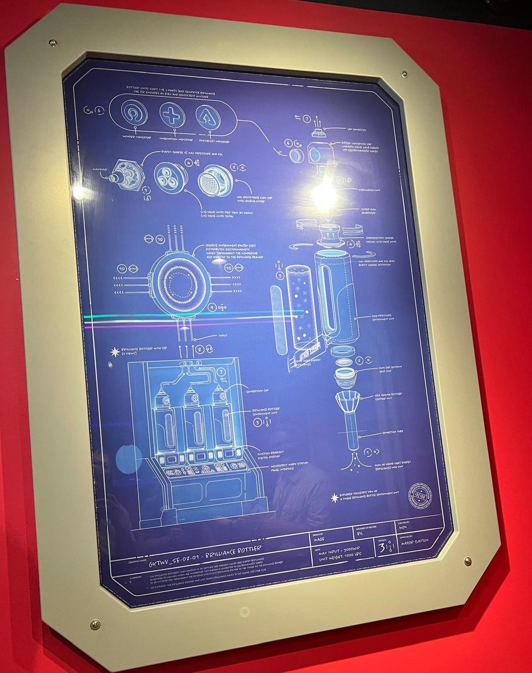 Evan’s illustrated design for the Brilliance Bottler is displayed on a wall.