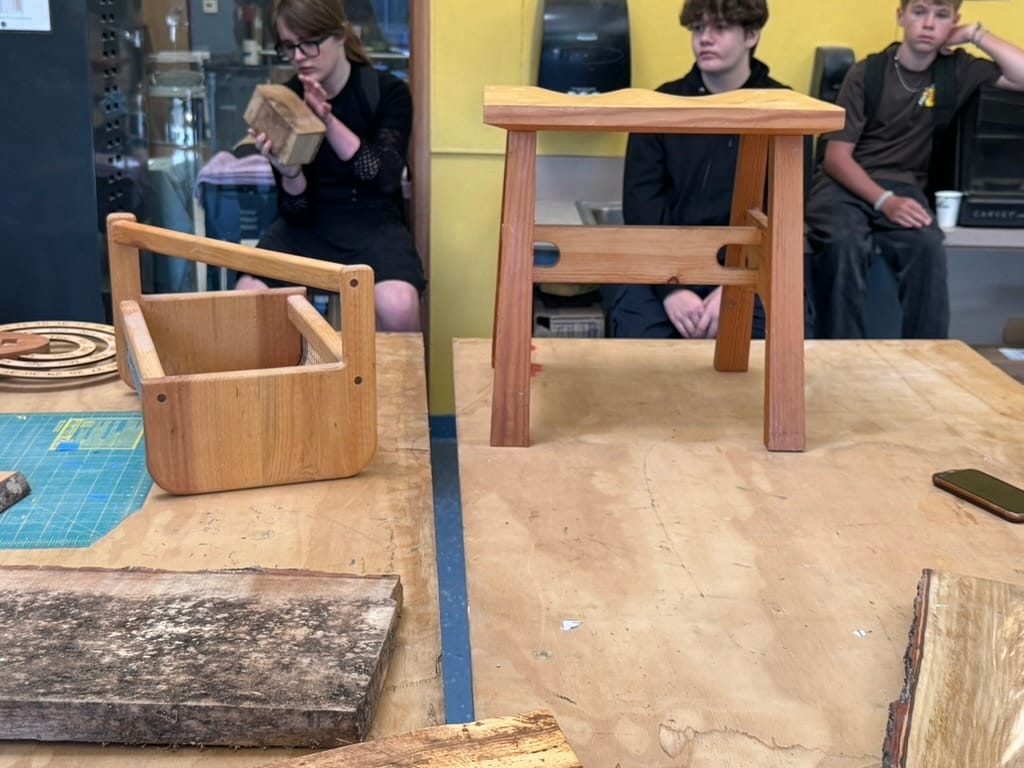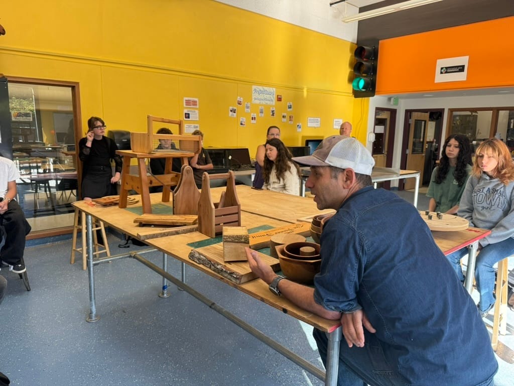 Former teacher and furniture maker Hillel Posner visited the Academy of Innovative Arts to show students how he mills wood from a fallen tree and then uses a variety of tools to make stools, bowls and other items.