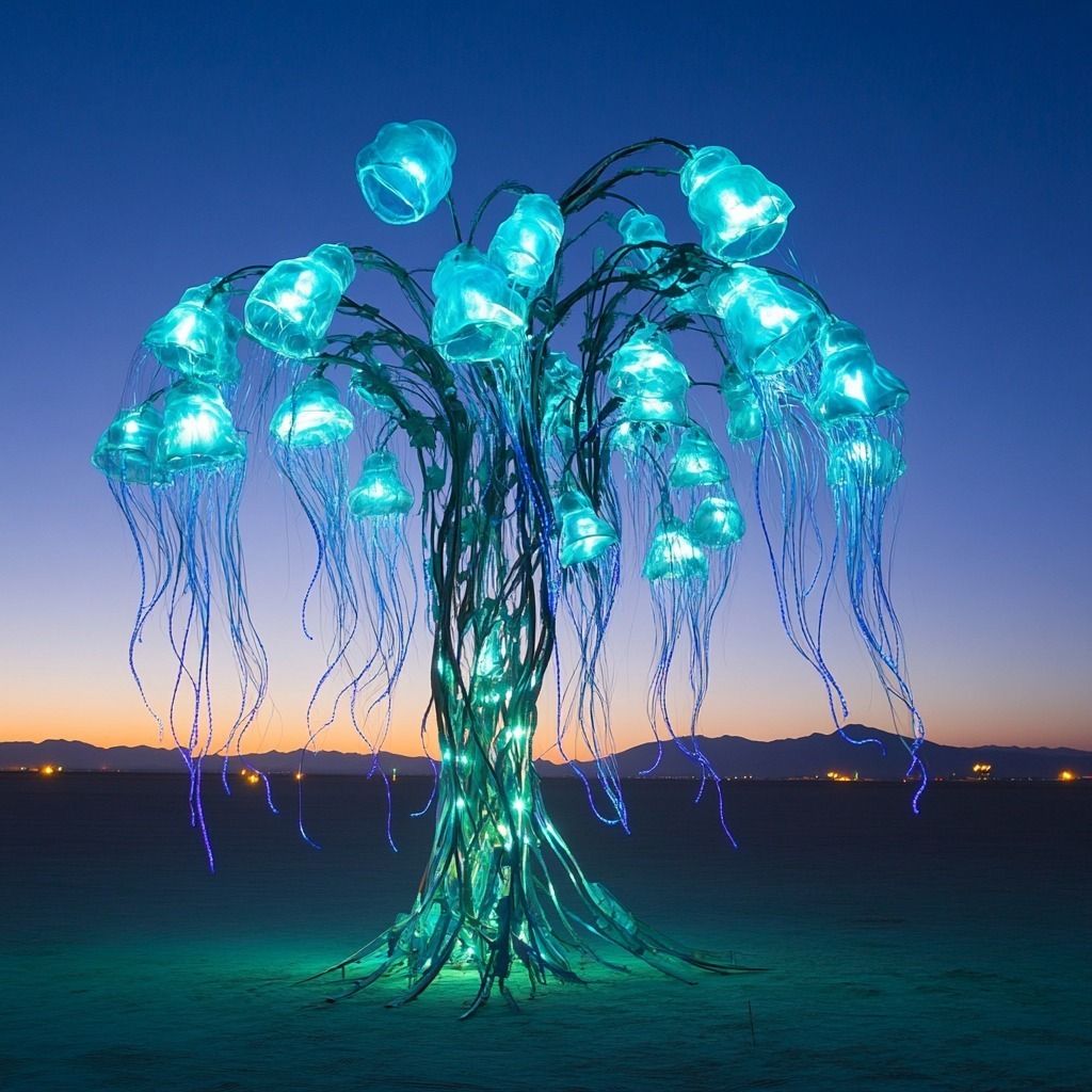 Anna Gribovsky - Aquatica. Aquatica is a 15-foot glowing kelp tree with LED-lit jellyfish, flowing tentacles, and ambient ocean sounds, creating an immersive, ethereal underwater experience.
